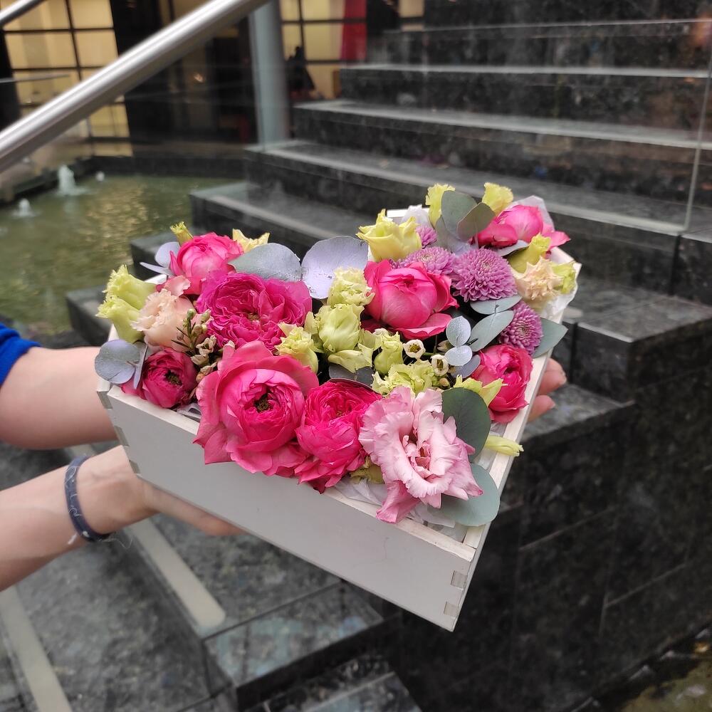 Роза кустовая пионовидная – 2 шт.Лизиантус – 2 шт.Хризантема кустовая – 1 шт.Ваксфлауэр – 1 шт.Эвкалипт – 1 шт.ящик сердце деревянный – 1 шт.