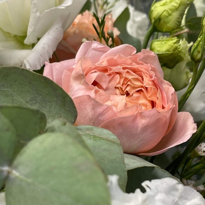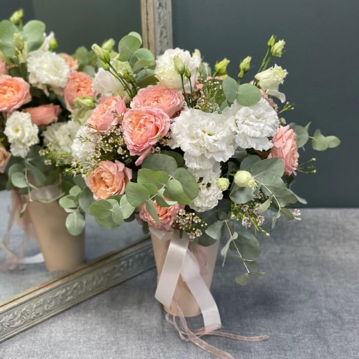 Эвкалипт – 2 шт.Лизиантус – 3 шт.Ваксфлауэр – 1 шт.Роза Джульетта – 3 шт.Коробка – 1 шт.Оазис флористический – 1 шт.