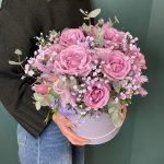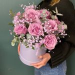 Цветочная композиция в шляпной коробке с розами и гипсофилой. Дарите радость и искренние эмоции просто так.* По вашей просьбе, мы подпишем открытку с наилучшими пожеланиями.* Каждый букет цветов (композиция цветов в коробке) упаковывается в прозрачную плёнку и в крафтовый пакет.* Для нежных сортов цветов предусмотрена временная ваза с водой-аквабокс.* К букету прилагается инструкция по уходу и пакетик с подкормкой для продления жизни срезанных цветов в вазе и цветочных композициях на флористической губке.