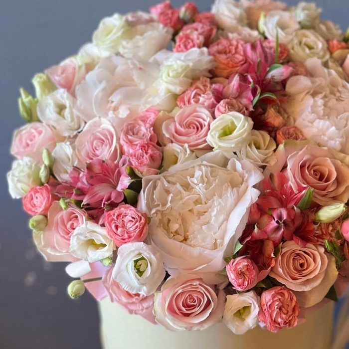 пионы – 5 шт.Кустовая роза – 7 шт.эумстома – 12 шт.Альстромерия – 10 шт.Роза – 11 шт.