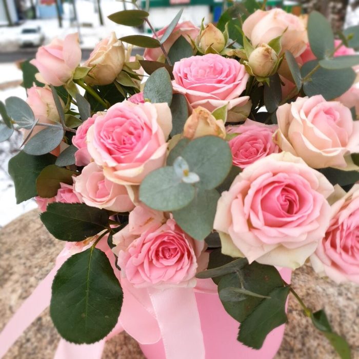 Эвкалипт – 3 шт.Лента атласная – 1 шт.Коробка шляпная – 1 шт.Роза кустовая пионовидная – 5 шт.Открыточка с вашими пожеланиями – 1 шт.Оазис флористический – 1 шт.любовь флориста (бесплатно) – 1 шт.