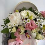 Цветы в коробке с пион розами,сиренью,ранункулюсами,эустомой,тюльпанами,матиолой,пионовидными кустовыми розами