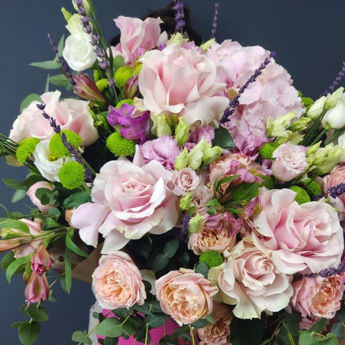 Альстромерия – 8 шт.Лизиантус – 6 шт.Фрезия – 7 шт.Роза французская – 8 шт.Пионовидная кустовая роза – 8 шт.Гортензия розовая – 1 шт.Эвкалипт Синерия – 7 шт.филин грин хризантема – 6 шт.