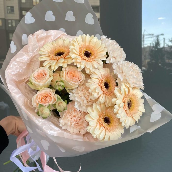Диантус – 4 шт.Гербера – 5 шт.Роза кустовая – 1 шт.Упаковка дизайнерская – 1 шт.