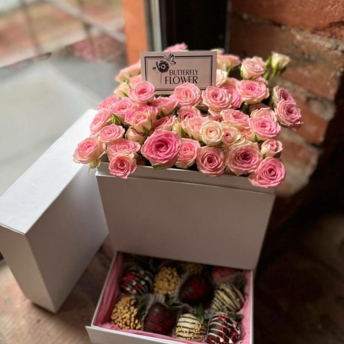Композиция из кустовых роз и сладкой клубники в бельгийском шоколаде “Кустовые розы и клубника”