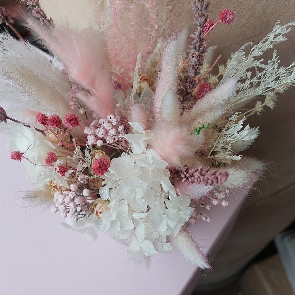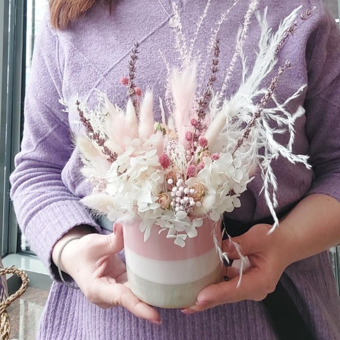 Стабилизированная гортензия – 1 шт.Лагурус (сухоцвет) – 22 шт.эрингиум розовый – 2 шт.лаванда розовая – 4 шт.Фаларис – 3 шт.Роза сухоцвет – 3 шт.Ягоды декоративные – 4 шт.гипсофила сухоцвет – 1 шт.пушистики – 5 шт.Оазис для сухоцветов – 1 шт.керомическое кашпо – 1 шт.