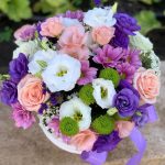 Роза розовая – 3 шт. Роза белая – 2 шт. эустома фиолетовая – 1 шт. Хризантема зеленая – 1 шт. Хризантема розовая – 2 шт. Статица синяя – 2 шт. эустома розовая – 1 шт. эустома белая – 1 шт.