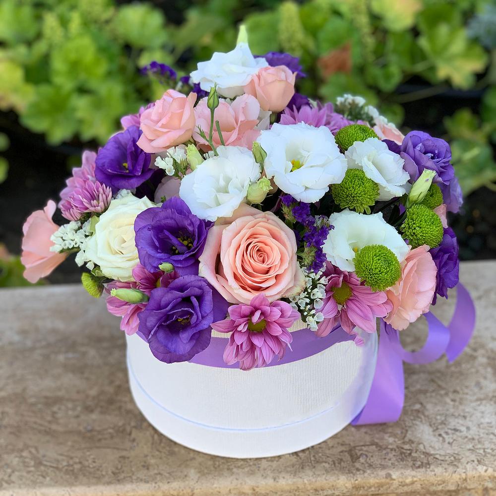 Роза розовая – 3 шт. Роза белая – 2 шт. эустома фиолетовая – 1 шт. Хризантема зеленая – 1 шт. Хризантема розовая – 2 шт. Статица синяя – 2 шт. эустома розовая – 1 шт. эустома белая – 1 шт.
