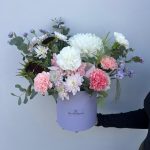 Хризантема Антонов – 1 шт.Диантус – 6 шт.Роза французская – 2 шт.Подсолнух – 2 шт.Паникум – 2 шт.Хризантема Балтика – 1 шт.Статица – 1 шт.Эвкалипт – 1 шт.Оазис флористический – 1 шт.Коробка шляпная – 1 шт.
