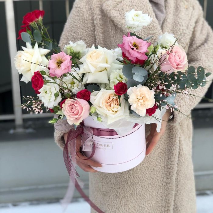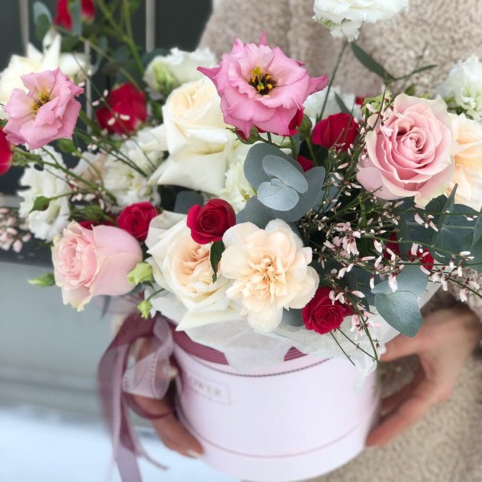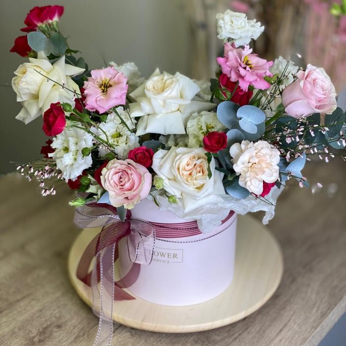 Роза одноголовая – 7 шт. Гвоздика сортовая – 3 шт. Гениста – 2 шт. Кустовая роза – 2 шт. Эустома – 3 шт. Коробка – 1 шт. Оазис – 3 шт. Эвкалипт – 2 шт.
