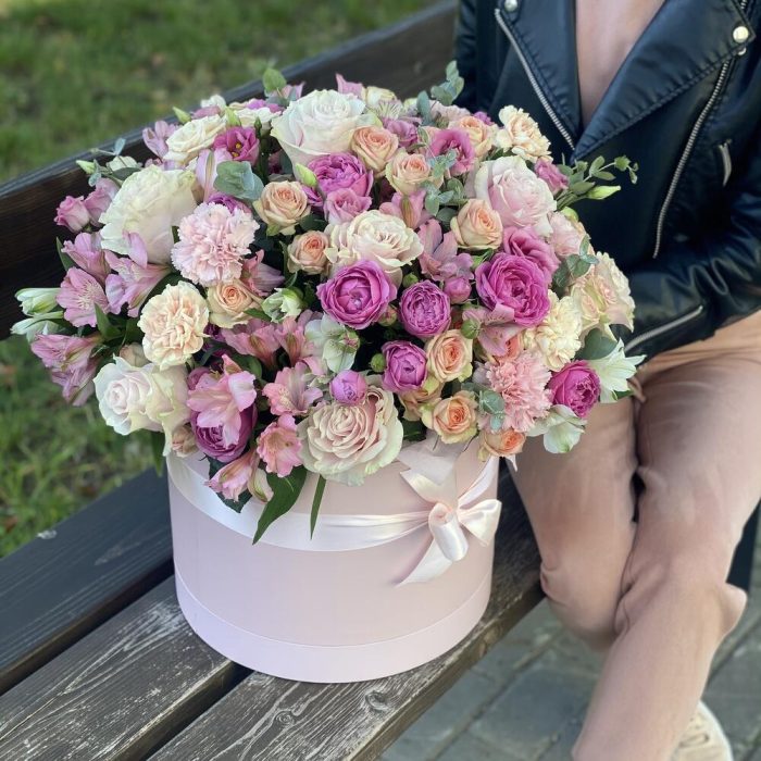 Коробка – 1 шт. Оазис – 4 шт. Эустома – 6 шт. Роза розовая – 10 шт. Эвкалипт – 4 шт. Кустовая роза – 18 шт. Гвоздика сортовая – 10 шт. Альстромерия – 13 шт. Оформление – 1 шт.