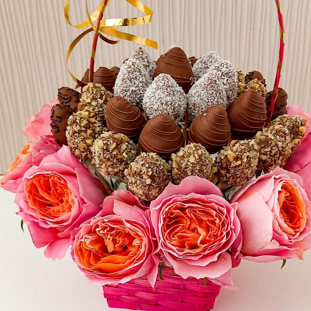 Клубника в шоколаде callebaut (бельгия) – 25 шт.Роза одноголовая – 13 шт.Корзина – 1 шт.