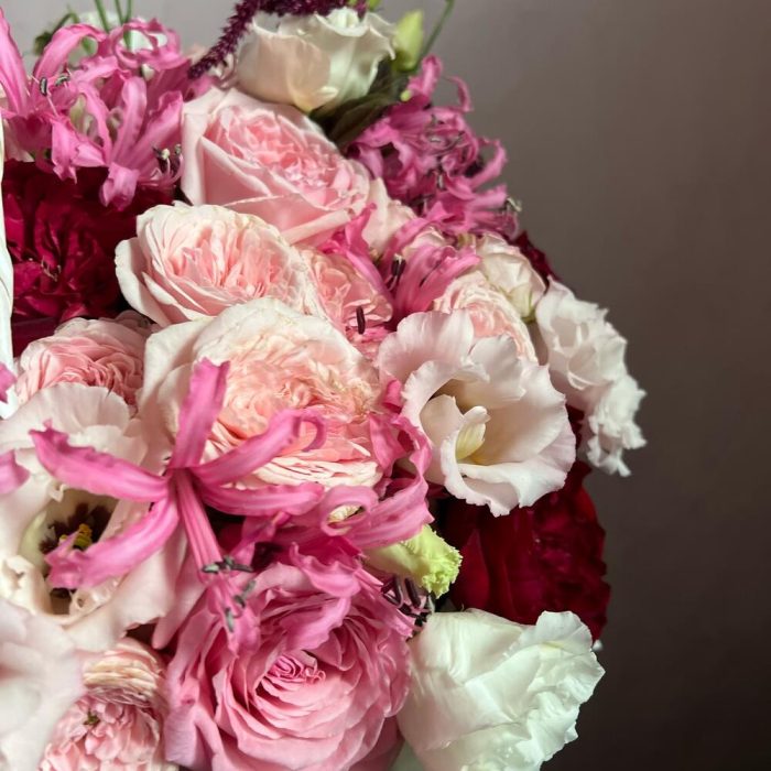 Эустома – 3 шт.Пионовидная роза – 21 шт.Кустовая пионовидная роза – 4 шт.Амарант – 2 шт.Корзина плетеная – 1 шт.Нерина – 8 шт.Флористическая губка – 1 шт.