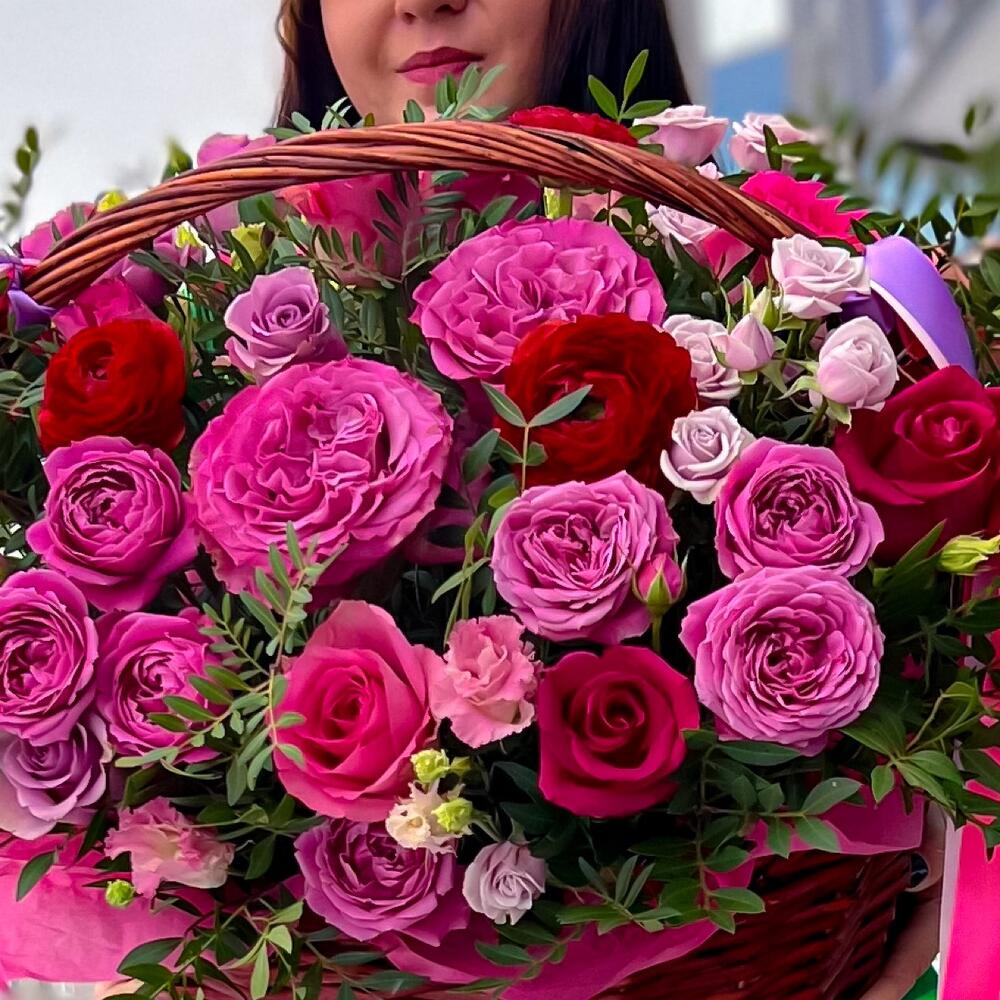 Корзина с пионовидными розами,ранункулюсами,эустомой и фисташкой