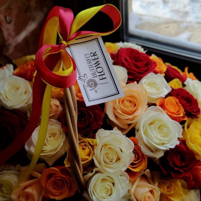Корзина со 101 разноцветной розой “Мозаика”