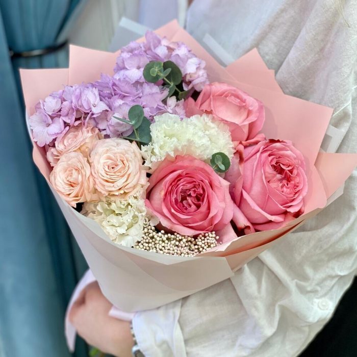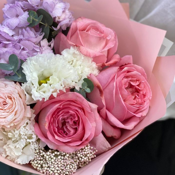 Гортензия – 1 шт.Озотамнус – 1 шт.Кустовая пионовидная роза – 1 шт.Пленка матовая – 2 шт.эустома белая – 1 шт.роза пинк экспрешн – 3 шт.эвкалипт 50 – 3 шт.