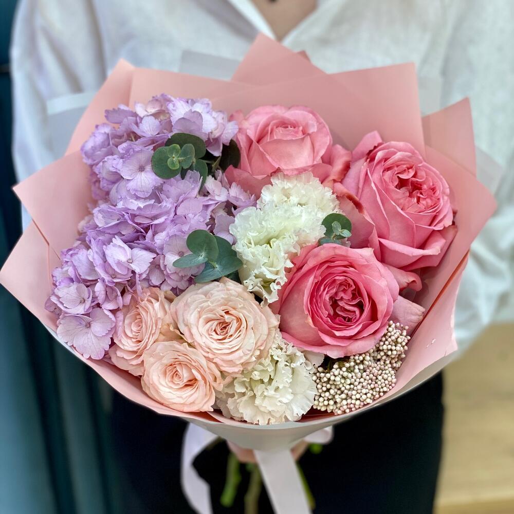 Красивый букет с гортензией и пионовидными розами