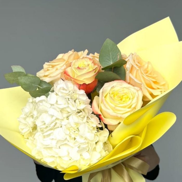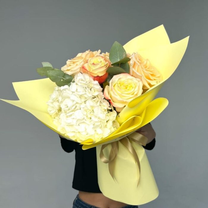 “Эвкалиптическая роскошь” гортензия и пионовидная кустовая роза