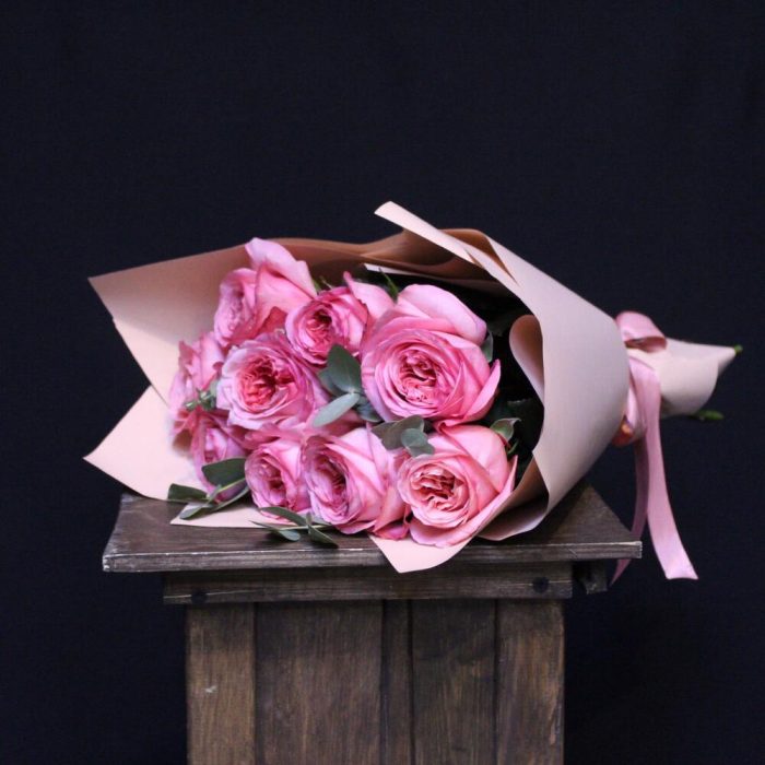 роза пионовидная pink xpression – 9 шт.Эвкалипт – 2 шт.Пленка дизайнерская – 2 шт.Лента атласная – 1 шт.