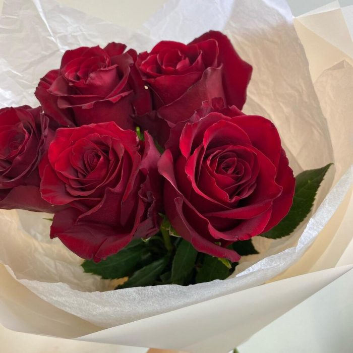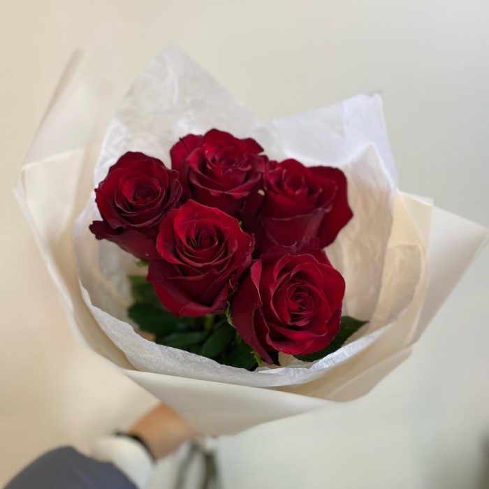 Упаковка с атласной лентой – 5 шт.Тишью белое – 2 шт.роза эквадор эксплорер премиум – 5 шт.