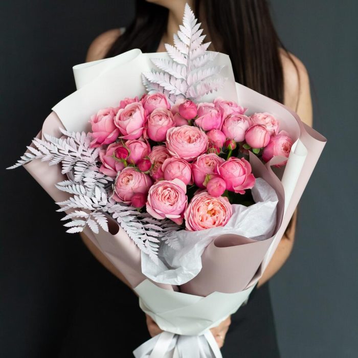 пионовидные кустовые розы сильвия пинк – 7 шт. Зелень крашеная – 3 шт.