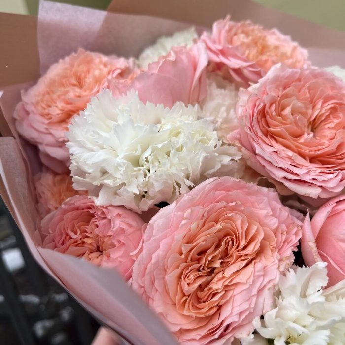 Лента атласная – 2 шт.Упаковка корейская пленка – 1 шт.диантус белоснежный – 9 шт.тишью нежно-розовое – 1 шт.роза премиум пионовидная джульетта – 4 шт.