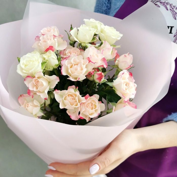 Нежный букет с кустовой розой в стильной дизайнерской упаковке
