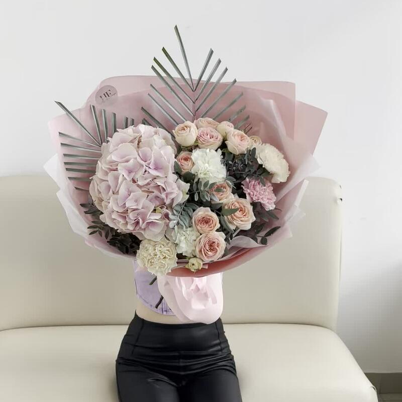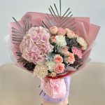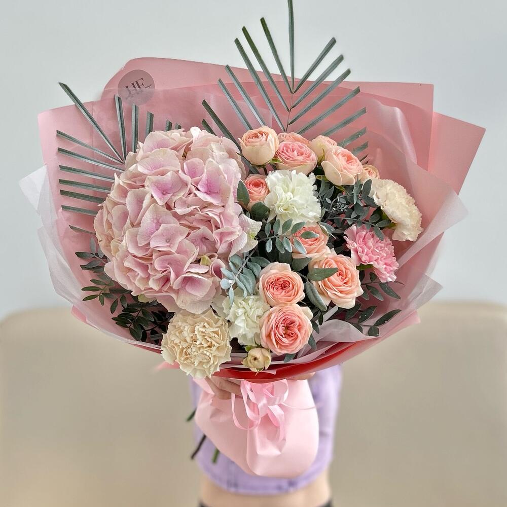 Гортензия – 1 шт.Роза кустовая – 2 шт.Лента атласная – 2 шт.Диантус – 5 шт.Пальма – 1 шт.Упаковка дизайнерская – 5 шт.