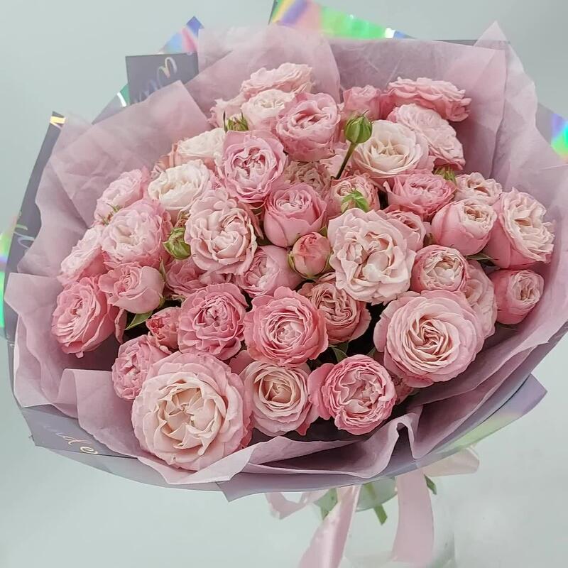 Нежные, пышные пионовидные кустовые розы Бомбастик в стильном, лаконичном монобукете – универсальный выбор по любому поводу или вовсе без повода. Можно преподнести маме, сестре, подруге, коллеге, любимой.