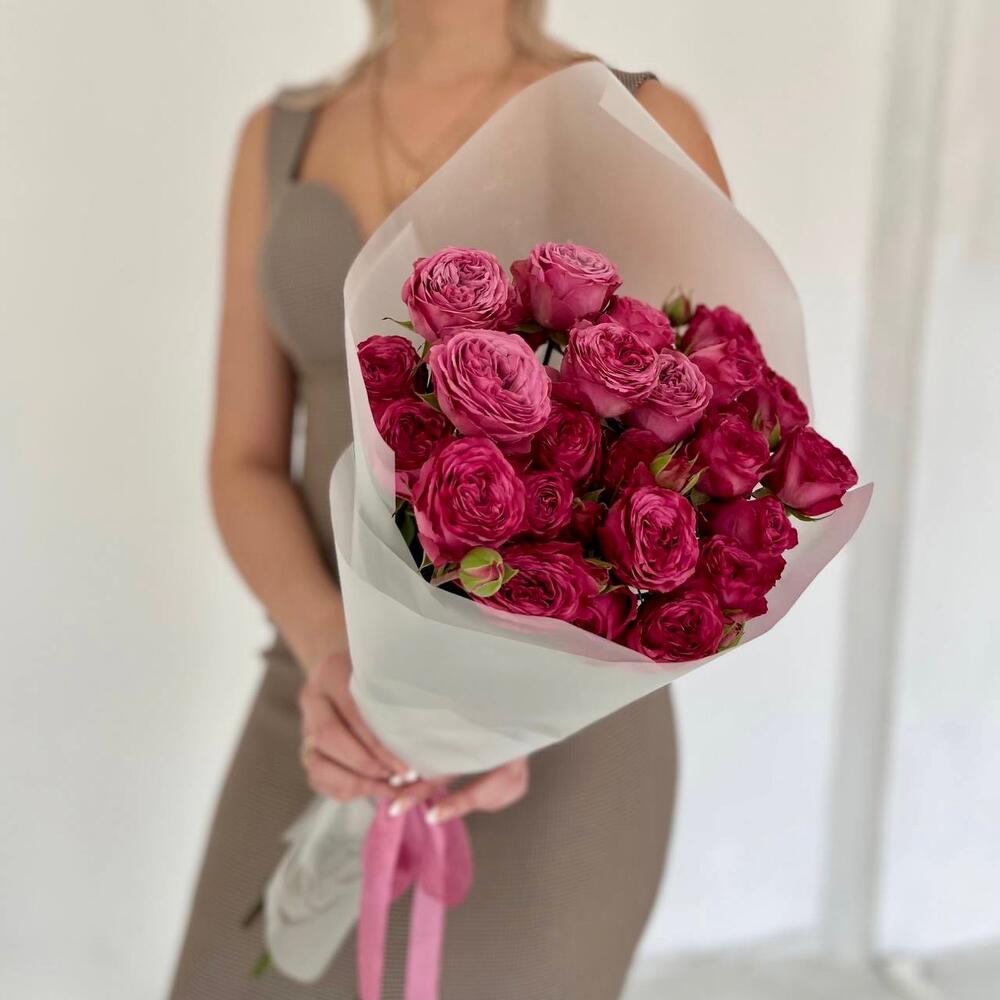 Роскошные пионовидные кустовые розы в дизайнерской упаковке