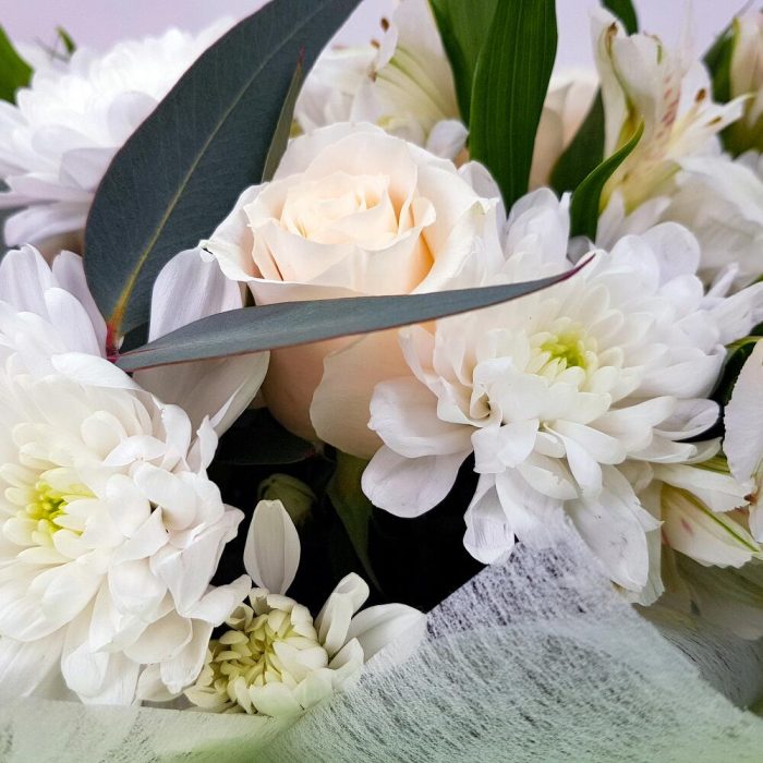 Роза одноголовая – 5 шт.Эвкалипт – 3 шт.Альстромерия – 3 шт.Хризантема Балтика – 3 шт.Упаковка – 1 шт.