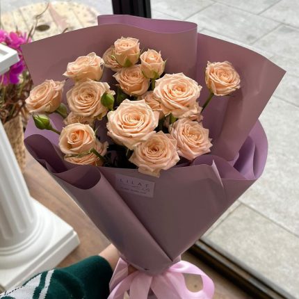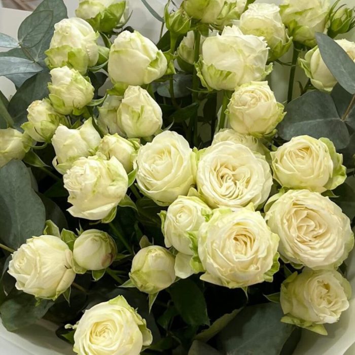 Пионовидная кустовая роза – 11 шт. Эвкалипт – 5 шт. Упаковка дизайнерская – 2 шт. Открыточка с вашими пожеланиями – 1 шт. инструкция по уходу за цветами – 1 шт.