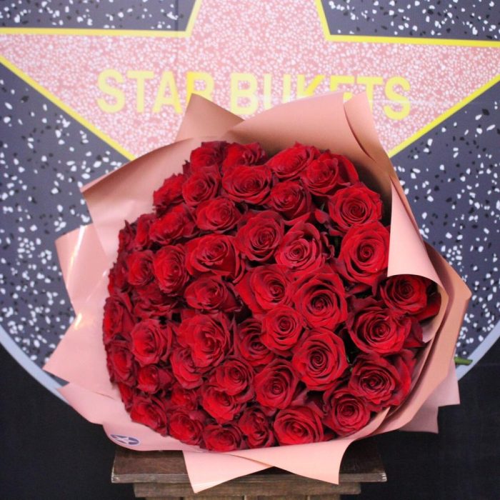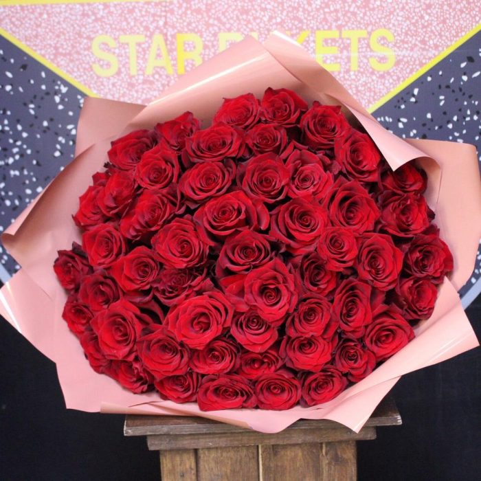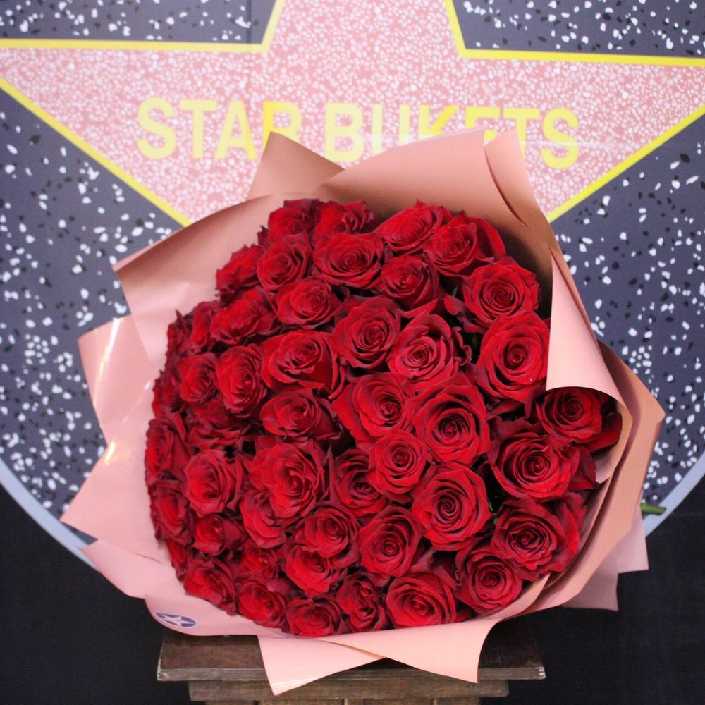 Роза Эксплорер – 51 шт.Пленка дизайнерская – 3 шт.Лента атласная – 2 шт.