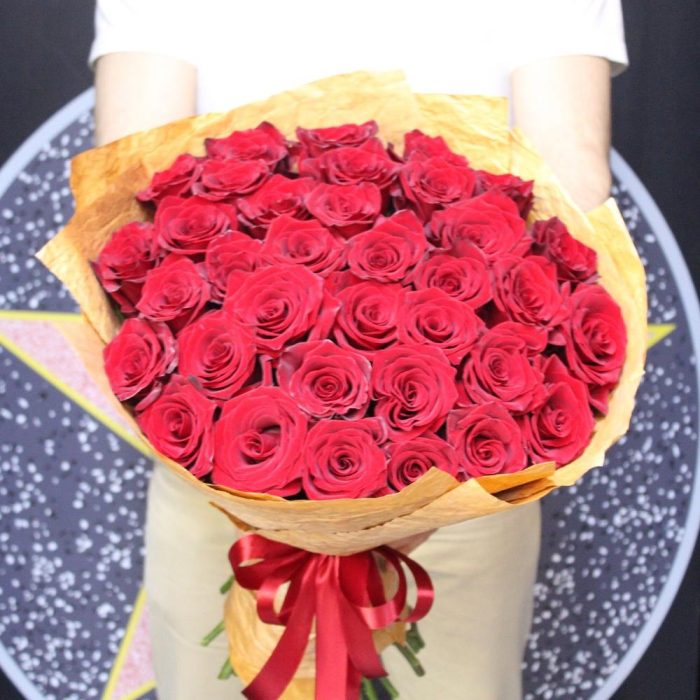 Роза Эксплорер – 35 шт.Крафт дизайнерский – 2 шт.Лента атласная – 2 шт.