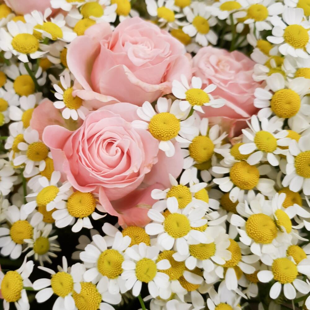 Роза кустовая Бомбастик – 4 шт.Упаковка – 1 шт.Ромашка кустовая – 19 шт.Аквапак – 1 шт.питательная смесь для срезанных цветов – 2 шт.