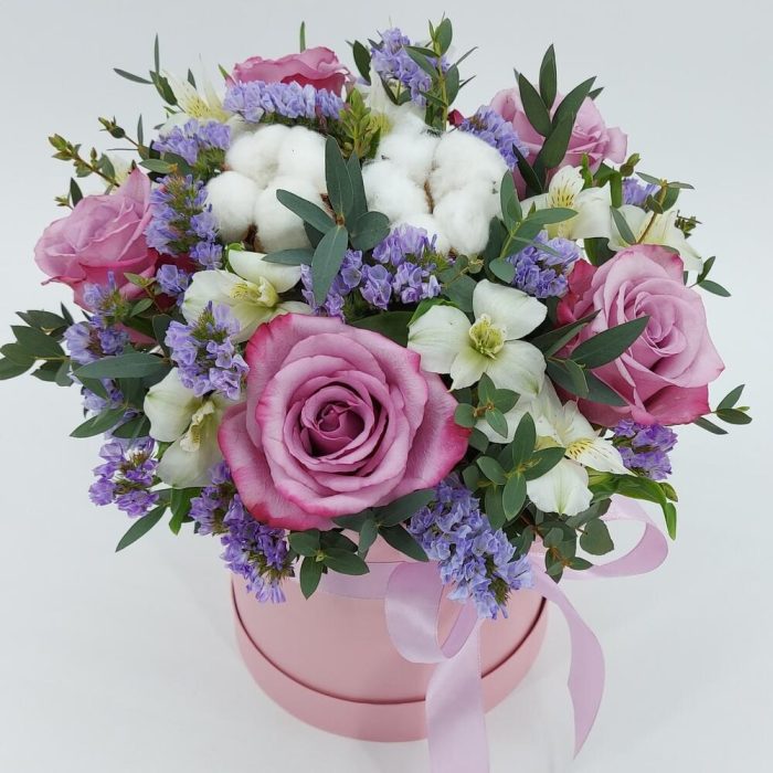 Розы, альстромерия и хлопок в коробке “Сиреневые облака”