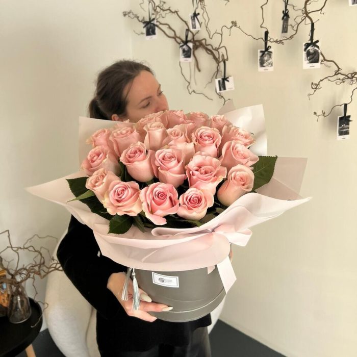 Розы в шляпной коробке – 25 шт