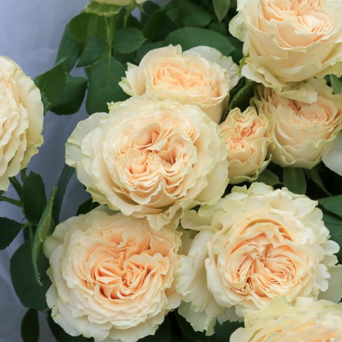 Пионовидная кустовая роза с легким цветочным ароматом.