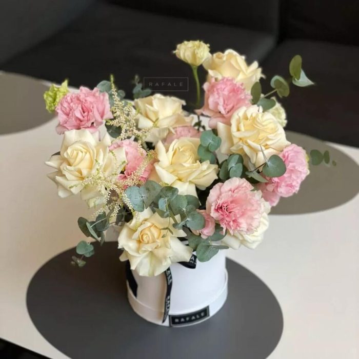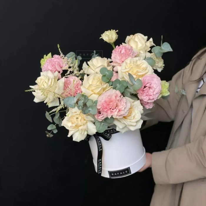 “Атлас☁️” – цветочная композиция с зефиром в деревянном ящике