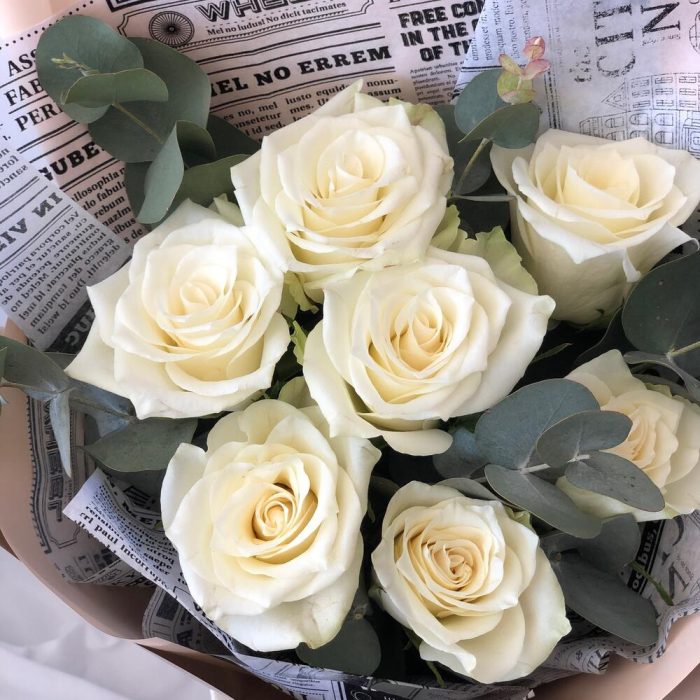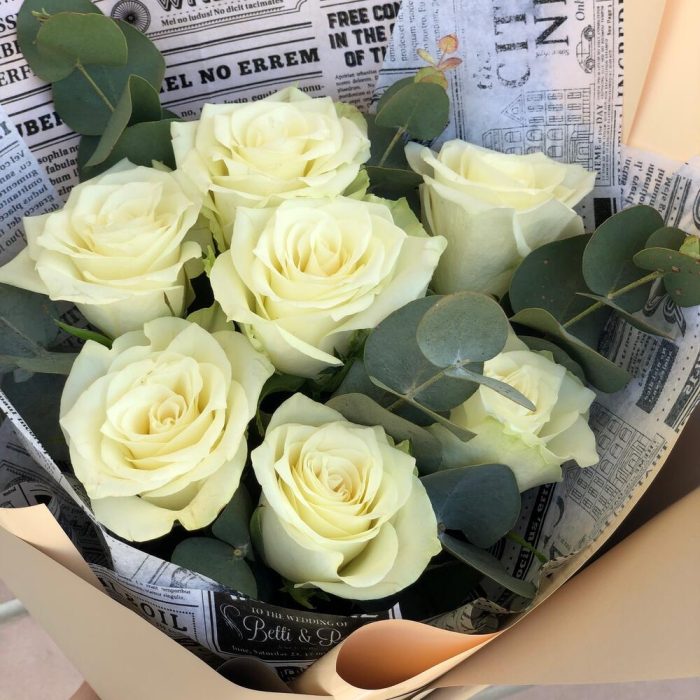 Эвкалипт – 2 шт.Роза Кенийская – 7 шт.Упаковка дизайнерская – 1 шт.Кризал (подкормка) – 1 шт.