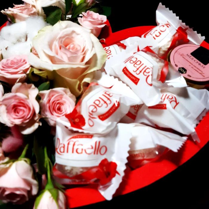 Красное сердце с нежной композицией из цветов с рафаэлло и мёдом -прекрасный подарок для девушек и женщин.Рафаэлло безусловно одна из самых желанных конфет на все времена.А свежие цветы для девушек и женщин -это всегда, радость и счастье.Побалуйте своих близких. ❤