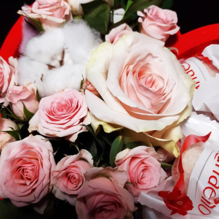 Хлопок – 1 гр.Раффаэлло – 8 шт.Роза пионовидная кустовая – 2 шт.Лагурус – 5 шт.Мед суфле – 1 шт.пенобокс сердце – 1 шт.роза куст микс – 11 шт.