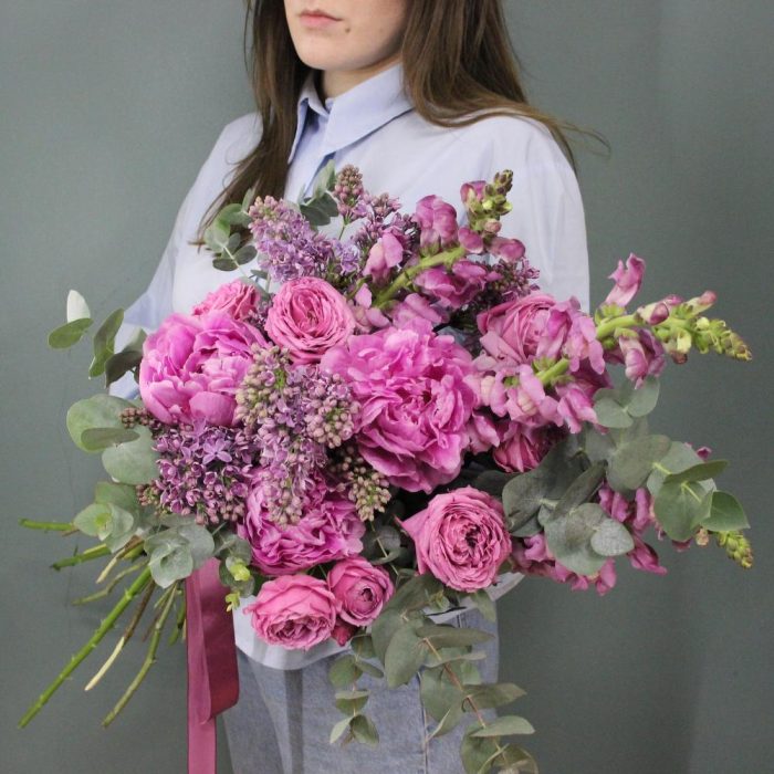 Сиреневый туман – Букет с пионами, сиренью и пионовидными розами