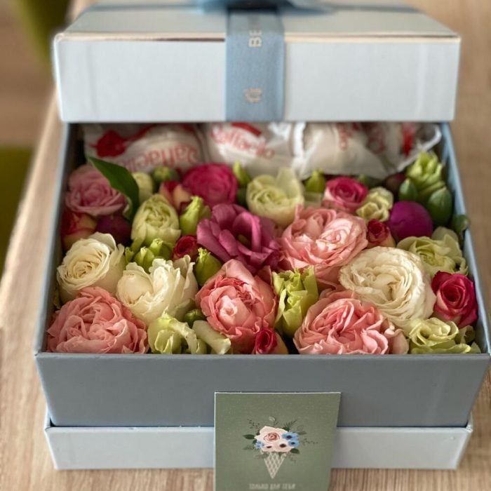 Кустовая роза – 4 шт.Зелень – 1 шт.Раффаэлло – 100 гр.Хризантема – 3 шт.Гвоздика – 3 шт.Эустома – 1 шт.Оазис – 1 шт.Коробка – 1 шт.