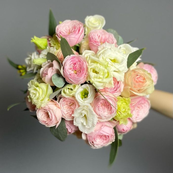 Роза кустовая – 6 шт.эвкалипт ветка – 2 шт.Лизиантус – 4 шт.Роза – 3 шт.Рускус – 7 шт.Лента атласная – 2 шт.Булавка с бусами – 2 шт.