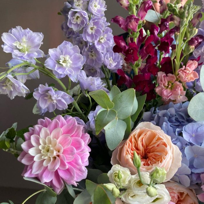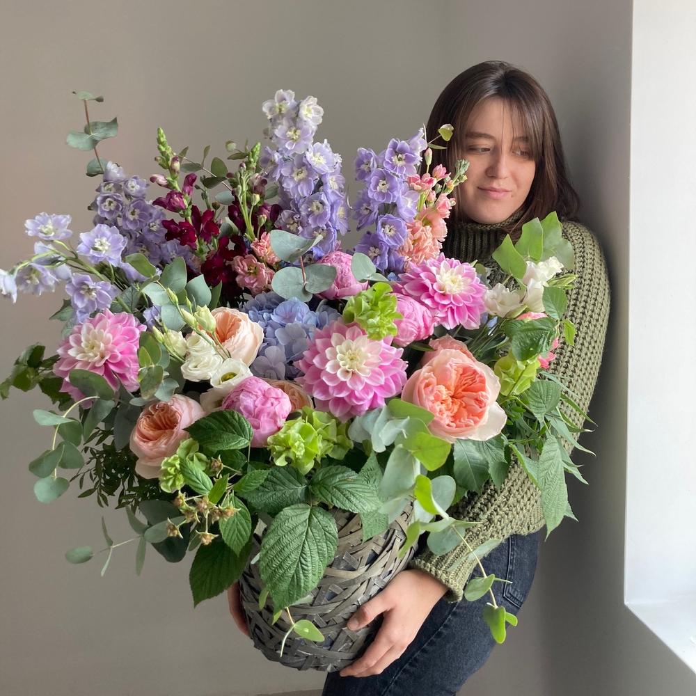 Душистая, садовая корзина с дельфиниумом, георгинами, гортензиями, пионовидными розами, маттиолой, львиным зевом, ирландскими колокольчиками, малиной и эвкалиптом.