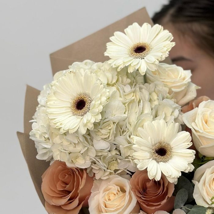 Флористы из студии “Varda Flowers” подобрали свежие и красивые цветы для создания букета, который наполнен положительными эмоциями и любовью. Они тщательно расположили каждый цветок в букете, учитывая его форму и цветовую гамму, чтобы достичь наилучшего гармоничного и красивого результата.