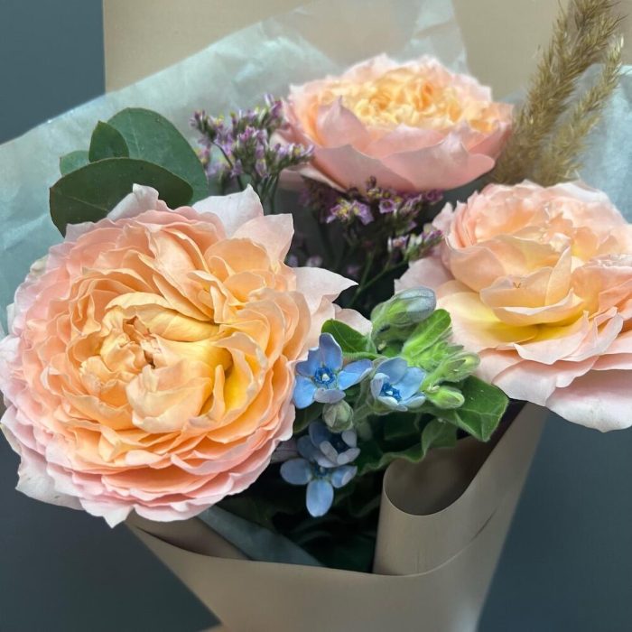 пионовидная премиум роза джульетта – 1 шт.твидия голубая – 1 шт.Тишью – 1 шт.Упаковка корейская пленка – 1 шт.Лента атласная – 1 шт.