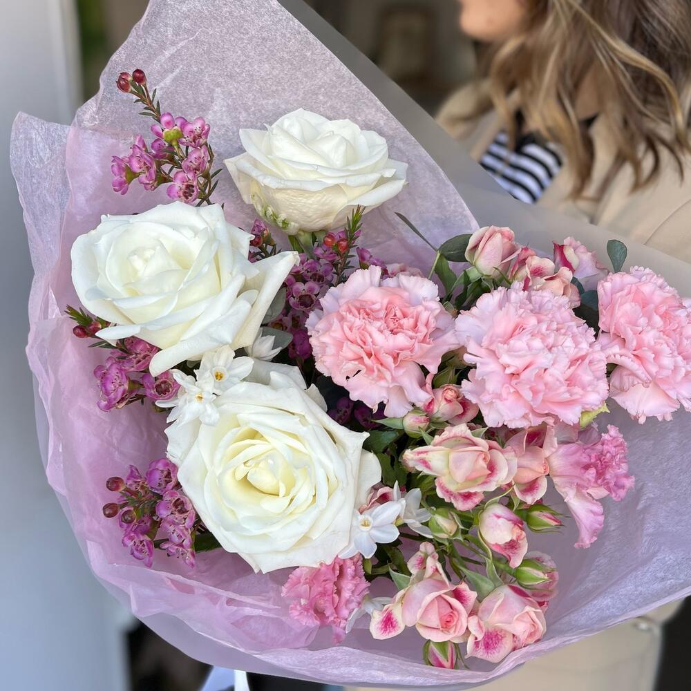 Диантус сортовой – 3 шт.мондиаль роза – 3 шт.Хамелациум – 2 шт.кустовой нарцисс – 2 шт.Роза кустовая – 2 шт.Эвкалипт Микс – 2 шт.Упаковка дизайнерская – 3 шт.Лента атласная – 1 шт.эустома алиса пинк – 1 шт.