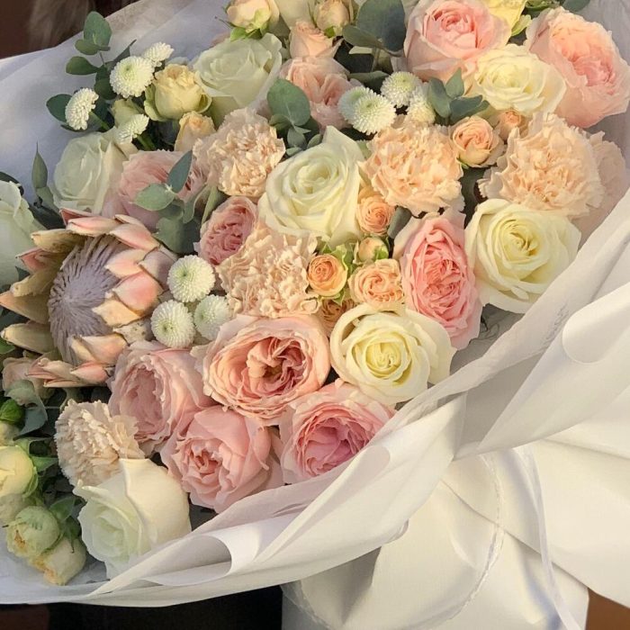 Протея – 1 шт.Сантини – 3 шт.Гвоздика – 5 шт.плайя бланка – 9 шт.хитоми – 5 шт.цумуги – 5 шт.кустовая роза микс – 7 шт.Фрезия – 4 шт.Эвкалипт – 9 шт.Упаковка дизайнерская – 7 шт.Лента – 1 шт.